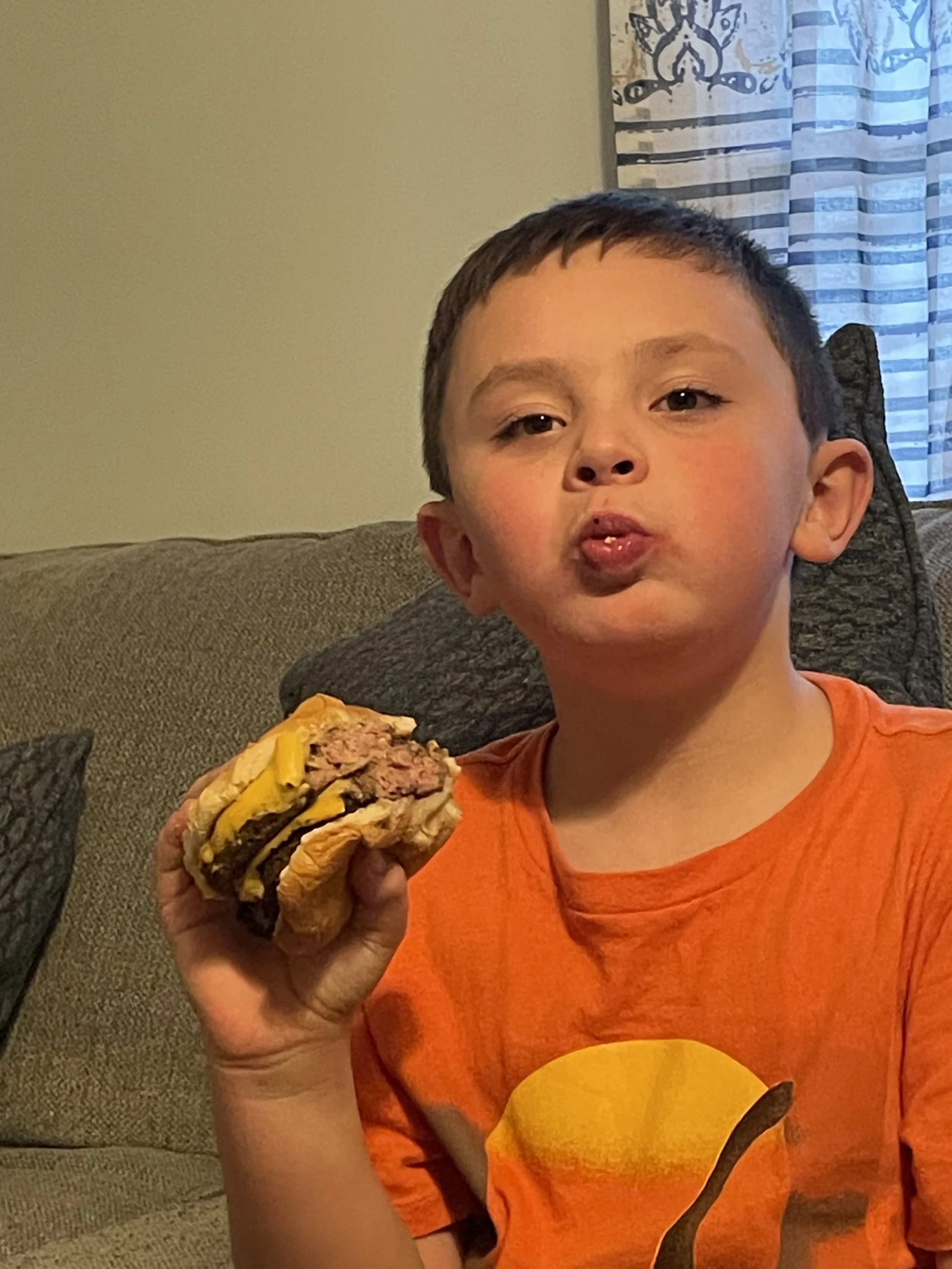 At first glance, he’s crushing a cheeseburger—but really, we’re building habits around real, whole food fuel.